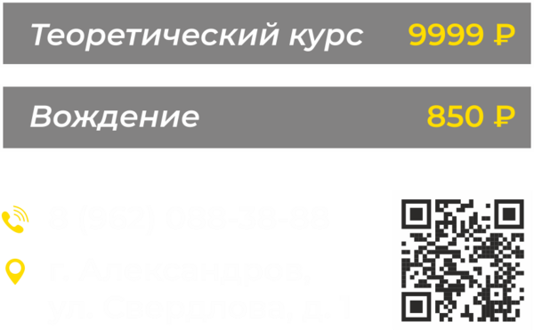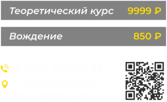 Итоговая стоимость обучения указана в договоре, Вам не придется доплачивать за бензин, въезд на автодром или другие услуги!